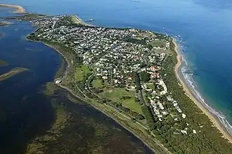 ![]() Looking east over Queenscliff to Sand Island. On the left is Swan Bay and the right is Port Phillip Bay. | |||||||||||||||