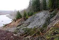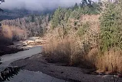 The Queets River is unusual in being a large river flowing through a relatively low-gradient, heavily forested alluvial valley. The forests on the western side of the Olympic Mountains have one of the highest rates of biomass production per unit area in North America. Discharge rates in the winter can be very high, sometimes with surges up to or over 100,000 cubic feet per second (2,800 m3/s).[6] This combination results in frequent log jams and new channels. The river is not kept clear of woody debris, making it one of the few North American rivers of its size in which large log jams are common.[9] The USGS operates a stream gage 4.6 miles (7.4 km) above the mouth of the Queets, 2.4 miles (3.9 km) downriver from the mouth of the Clearwater River. The mean annual discharge recorded over the lifetime of this gage up to 2009, is 4,347 cubic feet per second (123.1 m3/s). The peak maximum discharge was 133,000 cubic feet per second (3,800 m3/s), recorded on December 15, 1999. The maximum daily mean discharge was 91,100 cubic feet per second (2,580 m3/s), recorded on March 19, 1997. A minimum daily mean discharge of 281 cubic feet per second (8.0 m3/s) was recorded from September 25–28, 2005.[6]