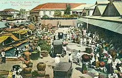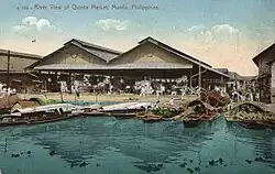 Quinta Market was built by the Spanish colonial government in 1851, the same year as the Divisoria Market in Tondo. Built with money bequeathed to the city government of Manila by businessman and philanthropist Francisco Carriedo in the 18th century,[1] its establishment coincided with the growth of industry and trade in the city and the establishment of new public markets to complement existing venues for trade both in the city center and its suburbs.[2] At the time, Quiapo was an attractive location for riverside villas along the Pasig River, and this was immortalized in the market's name, which translates to "country villa" in Spanish.[3]