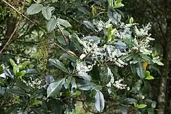 White flowers form on panicles between the months of October and November. The fruit is a grey brown capsule, 3 mm in diameter with three to five cells within. Several seeds grow within each cell. Fruiting matures from December to January.