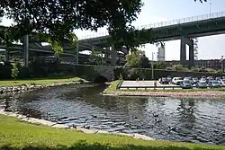 The Quequechan River is a river in Fall River, Massachusetts, that flows in a northwesterly direction from the northwest corner of the South Watuppa Pond[1] through the heart of the city of Fall River and into the end of the Taunton River at Mount Hope Bay at Heritage State Park/Battleship Cove. The word Quequechan means "Falling River" or "Leaping/Falling Waters" in Wampanoag, hence the city's name.[2]
