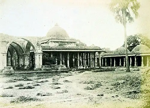 The nobles of the courts of Ahmed Shah, Sultan Qutubuddin Ahmad Shah II raised a small shrine first. Afterwards a mosque, a tomb to one of his sons, a large many-sided pond, and a vast mausoleum was built Mahmud Begada. The mosque and son's tomb are in the flat Hindu temple style, without arches or minarets. But in the large mausoleum, with a great gain in size, the arch takes the place of the beam, and the dome is raised high in air by a second tier of arches. The arch, uniformly used with one consistent design, has much beauty and propriety. The tomb is of the most elaborate workmanship surmounted by a richly inlaid canopy. But although the building is incomplete, it wants the outer aisles and has no stone trellis work in its windows.[3][4]