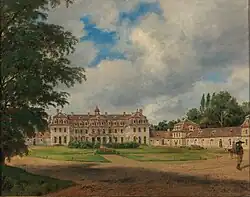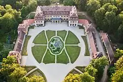 In the spirit of Louis XVI, a two-story building with a mansard roof and a courtyard of honor (German: einem Ehrenhof) was built between 1763 and 1769. The plans were drawn up by the French architect Isidor Marcellus Amandus Ganneval (Isidore Canevale) working in Vienna. A notable outbuilding is the dovecote, which was part of the palace and built at the same time and is an early example of the Neo-Gothic style. On the ground floor of the main building, the reception rooms from the last quarter of the 19th century have largely been preserved.[4]