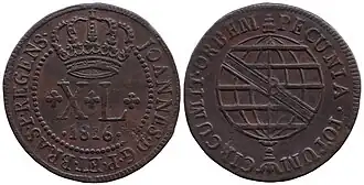 Between 1823 and 1833, the copper coinage of Brazil varied across the country, with denominations of 10, 20, 37+1⁄2, 40, 75 and 80 réis being produced. Silver coins continued in denominations of 80, 160, 320, 640 and 960 réis, along with gold 4,000 and 6,400 réis.