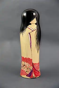 In 2015, she became the first foreigner to compete in the 57th Japanese National Kokeshi Competition, and was awarded the Governor of Miyagi Prefecture Award for her doll Kaguja hime.[8] In 2016, she was the first foreigner to compete in the 58th Japanese National Kokeshi Competition. She was the only foreigner to compete for the second time in the 58th Japanese National Kokeshi Competition, winning the grand prize in the creative category, the Japanese Minister of Economy, Trade and Industry's award for her work entitled "Dress-up Kokeshi - with a Wardrobe."[9] In addition to the perfect execution of the winning work, her creativity also attracted the attention of the jury. In addition to the kokeshi doll, the piece, made of hornbeam, beech and ashwood, includes a wardrobe with 17 meticulously crafted accessories such as kimonos, hats, umbrellas, lanterns and fans. The idea that a kokeshi doll can be dressed in different outfits and accessories to suit the season and the occasion is quite unique.[10] She was the first foreigner to get near to the closed cultural circle of Japanese Kokeshi making masters. She was welcomed and allowed closer to their professional knowledge and workshops techniques, which, according to Jennifer McDowell, an American kokeshi sociologist, as a woman, as a foreigner in a massively constructed masculine system, "can be seen as breaking through an anthropological wall."[1]