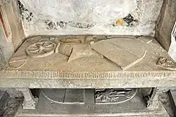 In addition, there was a large number of members of noble families and knights living nearby, although there were never found burials of the founders of the abbey, the House of Regensberg. Most of the burials respectively ledger stones are lost or destroyed – particularly the ones of the Toggenburg family and those of the nobilities that were deconsecrated by the Old Swiss Confederacy troops in June 1443 – or were re-used for buildings etc.