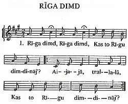 Rīga dimd (English: Riga resounds) is the title of a traditional Latvian folk song that is best known as a musical composition by Jānis Cimze. Cimze's first composition of the song is from 1872, and the composition was performed 1873 at the I All-Latvian Singing Festival by a male choir.[1] The tower bell music of the Saint Peter's Church in Riga, Latvia, plays Rīga dimd five times a day.