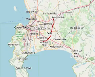 The proposed road is meant to extend the current R300 from its northern terminus (Stellenberg Interchange) with the N1 highway, past Durbanville, bending west, up to the Melkbosstrand and Blouberg coastal area.[5] It is also meant to extend the current R300 from its southern terminus (Mitchells Plain) junction with the M7 route (Jakes Gerwel Drive) westwards, through Zeekoevlei, up to the Muizenberg and Westlake area.[5]