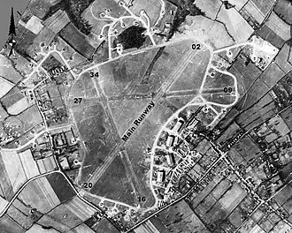 ![]() Aerial photograph of Bovingdon airfield looking north, the technical site with four T2 hangars is at the southeast of the airfield, the bomb dump is to the west, 13 March 1944 | |||||||||||
