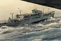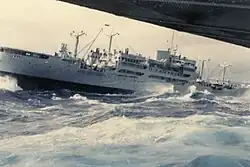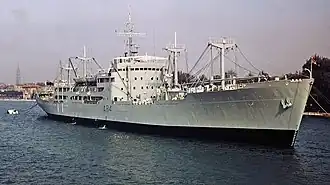 RFA Reliant (A84) was an air stores support ship of the Royal Fleet Auxiliary (RFA), the naval auxiliary fleet of the United Kingdom. She was formerly the commercial general cargo vessel Somersby which was purchased in 1956 and renamed on completion of her conversion in 1958. She was fitted for replenishing aircraft carriers at sea with a wide range of air, naval and victualling stores.[1] As refitted she had a helicopter landing pad built over the poop deckhouse.[2]