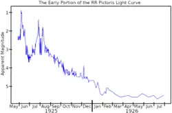 At the time of its discovery, RR Pictoris had an apparent magnitude of 2.3. It continued to brighten to magnitude 1.2, which it reached on 9 June 1925. It dimmed to magnitude 4 by 4 July, but brightened again to 1.9 on 9 August. Six months after its peak brightness, RR Pictoris faded to be invisible to the unaided eye, and was magnitude 12.5 by 1975.[6] RR Pictoris is classified as a slow nova[7] and its light curve exhibits positive superhumps, meaning superhumps with a period a few percent (8.6% in this case) longer than the star system's orbital period.[8]
