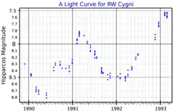 In 1885, T. H. E. C. Espin discovered that the star is a variable star. It was listed with its variable star designation, RW Cygni, in Annie Jump Cannon's 1907 work Second Catalog of Variable Stars.[12] RW Cygni is classified as a semiregular variable star. It is given the subtype SRc, indicating that it is a cool supergiant.[2] Its brightness varies from extremes of magnitude +8.0 and +9.5 with a period of 580±80 d. No long secondary period has been detected.[13]