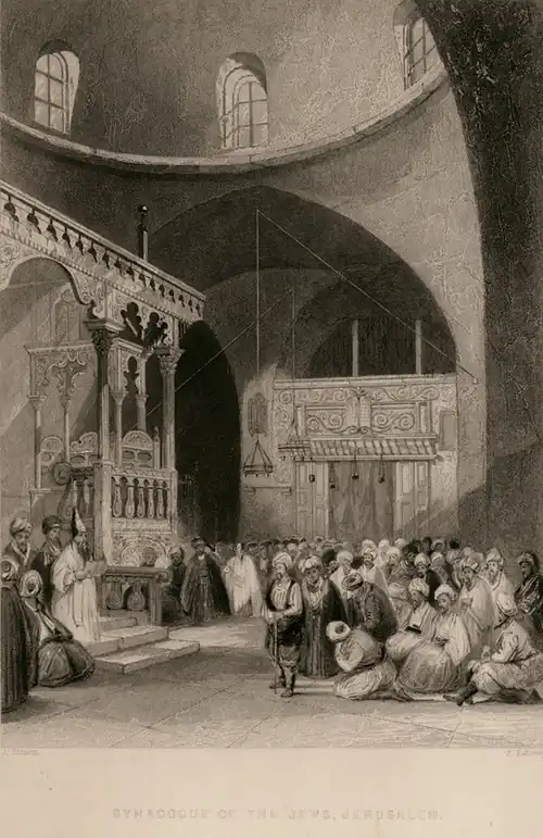 ![]() The synagogue, in c. 1825 (steel engraving from John Carne travelogue, publ. 1836) | |