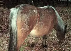 Rabicano, sometimes called white ticking, is a horse coat color characterized by limited roaning in a specific pattern: its most minimal form is expressed by white hairs at the top of a horse's tail,[1] often is expressed by additional interspersed white hairs seen first at the flank, then other parts of the body radiating out from the flank, where the white hairs will be most pronounced.[2] Rabicano is distinct from true roan, which causes evenly interspersed white hairs throughout the body, except for solid-colored head and legs.[1]