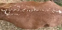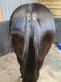The original definition of "rabicano" referred to the presence of white hairs in the base of the tail, a characteristic called a "skunk" or coon tail.[6] The term "coon tail" is associated with white hairs in the form of striping at the tailhead.[4] The sides of the tail at the tailhead may have much white hair. Extensively marked rabicanos sometimes exhibit striations in their pattern on the ribs, giving them a striped appearance.[7]