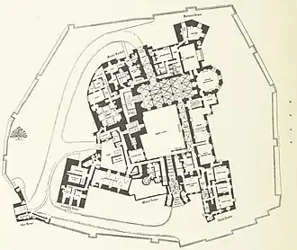 Raby Castle has an irregular plan, with nine towers along its perimeter. The main entrance was in the west through the four-storey Neville Gateway.[15] Access to the gatehouse was via a drawbridge, since replaced by a flagged causeway.[4] The gatehouse originally contained three portcullises, as is shown by the still-visible grooves used to work them.[14] Two smaller towers beside the gatehouse have no defensive function and were added during the renovations of Henry Vane, 2nd Earl of Darlington.[4]