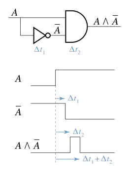 Consider, for example, a two-input AND gate fed with the following logic: A logic signal on one input and its negation, (the ¬ is a Boolean negation), on another input in theory never output a true value: . If, however, changes in the value of take longer to propagate to the second input than the first when changes from false to true then a brief period will ensue during which both inputs are true, and so the gate's output will also be true.[2]