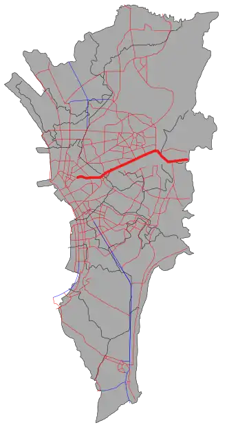 ![]() The route of Radial Road 6 in Metro Manila. Radial Road 6 is highlighted in red. | |