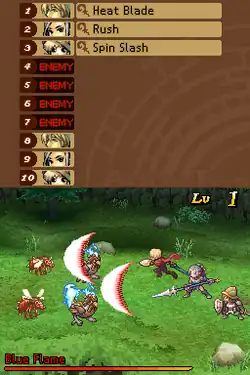 Enemies, represented by sprites, are visible while exploring environments. Running into them will trigger a battle, but Stocke can stun them with his sword and either avoid battle or trigger a preemptive attack. A cloaking ability unlocked later in the game enables the party to slip by enemies unseen.[3][7][8] Battles take place in a separate arena, with the battle itself and turn order information being displayed respectively on the bottom and top screen.[2][3][6] There is an auto-battle function, where the party will automatically perform basic attacks.[6] Successfully defeating the enemy party rewards the player party with money and experience points which level up the party members, giving them higher statistics such as raised health and more powerful attacks.[3][7][9]