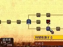 Aside from points where the story dictates the player's action, navigating the timelines is a non-linear process.[2] Story segments within each timeline, called "nodes", are color-coded depending on its content; brown nodes are chapters of the main story, blue boxes are events in which the player can make a choice which creates new paths in the timeline and can be revisited to take a different path, and dark boxes indicate a node with a bad ending or no way to continue the narrative.[5][6] Experience points and currency earned in battles are carried over between timelines.[7] Events across each timeline are tied to side quests the player can complete. While there are multiple endings depending on the path taken by the player, there are only two canon endings; the standard version, and an extended version unlocked by completing all side quests.[6]