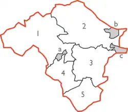 a) Llandrindod Wells UD, b) Knighton UD, c) Presteigne UD, 1) Rhayader RD, 2) Knighton RD 3) New Radnor RD, 4) Colwyn RD, 5) Painscastle RD