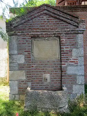 Ban Golescu is the subject of two epigrams, which were carved into stone near his fountain in Golești, and which were first translated into Romanian by George Fotino in 1943. According to Anghelescu, they may in fact be the Ban's own works.[102] Other than contributions by his own sons, he has preserved a legacy in Romanian literature through his mentions in Zilot Românul's rhyming chronicle—it depicts him as a servile figure at Hangerli's court.[42] Memoirist Ion Ghica includes mention of Golescu's unpopularity during his time with Caradja, when regular folk, subjected to harsh taxation policies, circulated a diddle mocking several boyars, including the line Golescu golește ("Golescu empties" or "Golescu strips one bare"); as noted in later scholarship, Iordache Golescu also renders this joke in his pamphlets, but without including the two words which addressed his own clan.[103] The Ban's legal quarrels over the emerald ring are also mentioned, and used as a plot device, in Nicolae Filimon's Ciocoii vechi și noi ("Upstarts Old and New"), which is one of the first Romanian novels.[43]