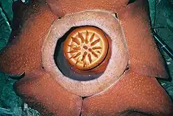 The plant has no stems, leaves or roots. It is a holoparasite of vines in the genus Tetrastigma (a plant in the Vitaceae, the grape vine family), spreading its absorptive organ, the haustorium, inside the tissue of the vine.[8] The only part of the plant that can be seen outside the host vine is the five-petalled flower. In some species, such as Rafflesia arnoldii, the flower may be over 100 centimetres (40 in) in diameter, and weigh up to 10 kilograms (22 lb). A Rafflesia that flowered in West Sumatra in 2019 was measured to be almost 4 feet (120 cm) in diameter, the largest flower ever recorded – 4 inches (10 cm) wider than the flower reported as the largest in 2017.[9] Even one of the smallest species, R. baletei, has 12 cm (5 in) diameter flowers. A team of morphologists and geneticists headed by Prof. Charles Davis of Harvard has discovered an important difference between Rafflesia spp. and the very similar Sapria spp. In both genera the petals are now described as sepals (or more correctly as "petaloid tepals") instead of vaguely defined "perigon lobes". In Sapria, the "diaphragm" is a true corona while in Rafflesia the diaphragm is made up of adnate petals to form a dome, the true corona being greatly reduced.[10]