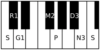 | Avarohanam | Ṡ N₃ D₃ P M₂ G₁ R₁ S |