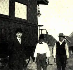 Railroad workers outside of the car. -