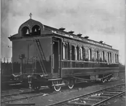 One of the first carriages for worship services appeared on the Transcaucasus Railway. In 1895, Yevgeny Volkov, head of the educational department of the Ministry of Railways of the Russian Empire, wrote in a report to Prince Mikhail Khilkov, head of the Ministry of Railways, that there was a type of mobile Orthodox church-a carriage that could not be better suited to the peculiar living conditions of railway employees on roads running through sparsely populated areas. According to him, moving from place to place and stopping at points where railway employees lived, such a church could gather both railway employees and residents from nearby villages on holidays and days of worship. As a result, it was decided to transfer this experience to the Siberian Railway. As a result, in 1896, a temple car was built at the Putilov Plant (later renamed the Kirov plant), consecrated in honor of St. Olga.[25]