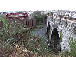 The CR line passed over three of the many Cornwall Railway viaducts. These were originally built from timber but were all rebuilt in more durable materials between 1899 and 1908.[50] The first was the 321 feet (98 m) long Stonehouse Pool viaduct which was rebuilt in brick with iron girders in 1908 and, since it no longer carries trains, its girders have been replaced an abstract artwork that is said to represent the railway as it passes along the Sea Wall. The next two structures were either side of Keyham station. Keyham viaduct (432 ft) was rebuilt in brick with girders in 1899 and later with steel girders in 1937. The longer Weston Mill viaduct (1,200 ft) crosses Camel's Head creek was replaced in 1903 with short brick viaducts either side of a four-span bowstring girder structure. The railway then crosses 100 feet (30 m) above the River Tamar on the 2,187½ feet-long Royal Albert Bridge.[5]