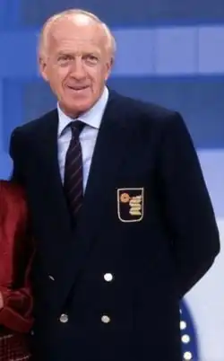 His first famous partner on the small screen was Ugo Tognazzi with whom, starting from 1954, he hosted the satyrical show Un due tre; the show was halted in 1959 after the duo performed an ironical sketch about the then-president of the Republic, Giovanni Gronchi.[2][3] Vianello then moved full-time to cinema, appearing in a total of 79 films between 1947 and 1968. In the 1970s he returned to RAI (the Italian state broadcasting company, then the only one existing) with a series of Saturday shows which made him and Mondaini extremely popular as hosts and authors of sketches.[3] During his TV career Vianello also hosted quiz shows, such as Zig Zag and Il gioco del 9 on Canale 5; he also hosted the 1998 edition of the Sanremo Music Festival[1] and, from 1991 to 1999, Pressing, Mediaset's Sunday night sports talk show.[3]