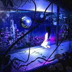 Like Birth of a New Day, Rain Temple features a default and an animated version of its artwork made by art designer Gustavo Torres, professionally known for his art project Kidmograph, which was previously well-known on social media platforms such as Tumblr for producing other vaporwave art and for working with other mainstream artists.[2][29][30] The artwork features a woman and a ball inside a building that is being taken over by growing leaves and trees. The woman is viewing the panoramic view of a cyberpunk city similar to the one featured in the cover for Birth of a New Day.[2][9] The animated version features moving rain drops and moving leaves and has been described as "fucking gorgeous" by some Twitter users.[31]