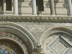 No details of Rainaldo's biography are known. Extent and timing of his contributions are also uncertain. Usually Rainaldo is thought to be an architect overseeing (in the 12th century) an extension of the nave by adding three bays consistent with the original style of Buscheto, enlarging the transept, and planning a new facade which was completed by workers under the direction of the sculptors Guglielmo and Biduino.[3] The exact date of the work is unclear: according to some, the work was done right after the death of Buscheto about the year 1110, though others say it was done closer to 1140, yet other researchers suggest the end of the century.[4] In any case, work was finished in 1180, as documented by the date written on the bronze knockers made by Bonanno Pisano found on the main door. Fedotova[5] credits Raynaldo with a dominating architectural composition of the new facade, with four levels of arches and pillars, dating this change 1150–1160.