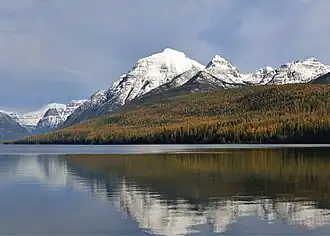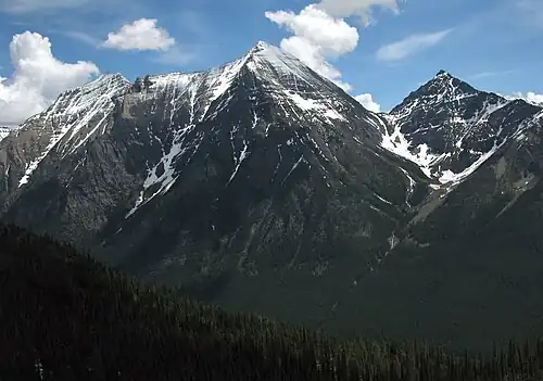 ![]() Rainbow Peak centered, with Bowman Lake in the foreground | |