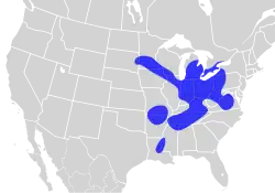 The rainbow darter is a small, benthic freshwater fish found in many creeks and small to medium-sized rivers throughout North America. In particular, it is common throughout the eastern United States, specifically throughout the Great Lakes and Ohio River Valley regions. Its distribution extends south to northern parts of Alabama and as far west as Missouri and Arkansas.[3] This distribution has been suggested to be due to once existing glaciers and to its intolerance of brackish water. One study to examine the phylogeography of E. caeruleum and its colonization patterns found its distribution is greatly due to historic glaciations, and furthermore, due to distributions from drainages which have since then resulted in the current morphological diversity of the rainbow darter.[4] Geographically, the rainbow darter is one of the most abundant and common darter species. Current distribution shown may be outdated and should be verified with state agencies. Particularly Texas where the species exists in limited number.