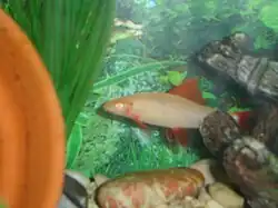 The rainbow shark has an elongated black, dark blue or bright blue body. The snout is pointed. The abdominal area is flat. The fins possess red to orange-red coloration. The linear area from the gill cover, the eye, and the mouth has a characteristic brief stripe. Compared to females, male rainbow sharks have thinner bodies with black lines along the tailfins. Males also have brighter coloration. They can grow up to about 6 in (15 cm) long.[3][4]