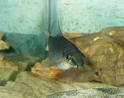 The rainbow shark (Epalzeorhynchos frenatum) is a species of Southeast Asian freshwater fish from the family Cyprinidae.[2] It is also known as the ruby shark, red-fin shark, red-finned shark, rainbow sharkminnow, green fringelip labeo, whitefin shark and whitetail sharkminnow.[3][4] It is a popular, semi-aggressive aquarium fish. Unlike true sharks, which belong to the Chondrichthyes ("cartilagenous fishes") lineage, the rainbow shark is an actinopterygiian ("ray-finned fish").