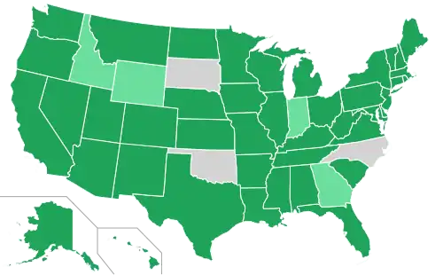 Nader qualified to appear on the state ballot in 43 states along with the District of Columbia. In four states, Georgia, Indiana, Idaho, and Wyoming, Nader's name did not appear on the state ballot but he was eligible to receive official write-in votes that were counted. In 3 states, North Carolina, Oklahoma, and South Dakota, Nader neither appeared on the state ballot nor was he eligible to receive write-in votes.