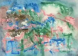 Unlike better-known abstract expressionists, Rosenborg made small paintings and gave preference to gouaches and watercolors over oils.[52][38] From his mentor, Henriette Reiss, he had learned a style of abstraction that involved symbolic interpretation of natural rhythms.[10] Critics noted a preference for a gestural abstraction rather than a geometrical one.[30][53] They also saw a persistent use of symbols, noting a similarity to the work of Wassily Kandinsky and Paul Klee.[note 15] Throughout his career critics further saw a distinct lyricism in Rosenborg's work.[note 16] Rosenborg's 1937 watercolor, "Abstracts in Blues and Greens" (at left above) illustrates his early watercolor style. "The Far-away City" of 1941 (at right above) illustrates his early style in oils. "American Landscape" (at left above) illustrates his late style in oils. "Landscape with Pink, Green, and Blue" (at right above) illustrates his late watercolor style.