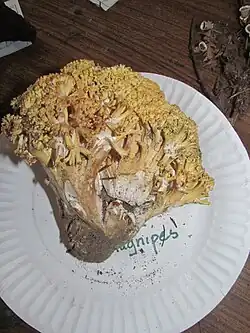The coral-shaped fruit bodies are relatively large, with dimensions of 9–25 cm (3+1⁄2–9+7⁄8 in) by 14–24 cm (5+1⁄2–9+1⁄2 in). The large stipe, which roots into the soil, is tapered to conical, measuring 7–14 cm (2+3⁄4–5+1⁄2 in) long by 4–6 cm (1+5⁄8–2+3⁄8 in) thick;[2] it stains brown in age.[3] The color of fresh fruit bodies ranges from light yellow to brownish pale orange (with white flesh), while dried specimens tend to be paler, from pale yellow to grayish orange (with pale yellow flesh);[2] the flesh has a slow and mild amyloid reaction.[3] The branches are compact (giving the fruit body a cauliflower-like appearance), with about six branches from the base. The primary branches are thick, up to 3 cm (1+1⁄8 in) in diameter, while the secondary branches are usually in the range of 0.2–1 cm (1⁄8–3⁄8 in) in diameter. Its flesh has a weakly aromatic or fabaceous (bean-like) odor, and a weakly fabaceous or bitter taste.[2]