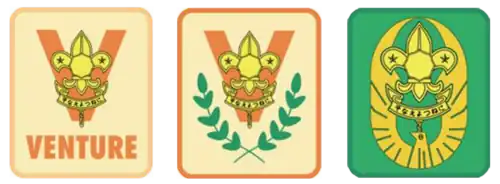 The rank program uses a series of medals and patches as emblems. The left-pocket badge oval shape and coloration is based on the rank badges used by the Boy Scouts of America between 1972 and 1990. The badge for the Apprentice or Scout rank consists of a simple fleur-de-lis, which symbolizes a compass needle. The needle points the Scout in the right direction, onward and upward.[4] This is the only badge to have a button loop, to emphasize its temporary status and that a Scout should soon move on to Tenderfoot. The next two ranks show the rank highlighted with the rest of the emblem subdued into the background. The Tenderfoot badge takes the fleur-de-lis of the Scout badge and incorporates the sacred mirror Yata no Kagami, which represents wisdom and honesty. The stars symbolize truth and knowledge. The Second Class badge features a scroll inscribed with the Scout Motto, with the ends turned up and a knotted rope hanging from the bottom. The knot reminds each Scout to remember the Scout slogan, Do a Good Turn Daily, and the upturned ends of the scroll symbolize cheerfulness in service.[5] The First Class badge combines the elements of the Tenderfoot and Second Class badges. The First Class badge is essentially the same as the emblem of the SAJ. Chrysanthemum has a First Class symbol on a stylized white chrysanthemum, the symbol of the Japanese Royal Family. Fuji Scout was originally the ultimate rank at the Scout level, and thus of Japanese Scouting itself, prior to the creation of Venture Scouting. Now it is the highest level in Venturing, still the highest youth rank overall.[6]