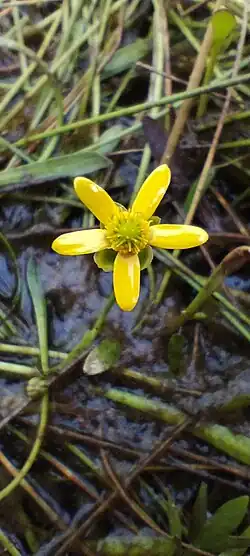 Ranunculus papulentus flower and peduncle. Individuals can have 1-4 flowers, each with 5-6 sepals.