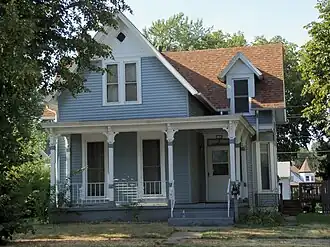 This Vernacular Eastlake cottage shows elements of the Queen Anne and Gothic Revival styles.[3] It is a 1½-story house features an irregular plan, a steeply pitched roof, and bits of gable-end decorations. There are also decorative details across the top of the porch. Also noteworthy are the textured wall surfaces and the paneled vergeboards.[2]