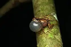 The adult male frog measures 23.2โ25.2 mm (0.91โ0.99 in) from nose to rear end and one female specimen measured 29.3 mm (1.15 in). The skin of the dorsum is light brown in color with darker brown marks. There is a dark brown mark on each side of the body, stretching from each front leg to each hind leg, meeting in the middle to make a V shape. There is a light brown intraorbital mark. Most of the snout is gray. There are many brown-black spots on the back. The iris of the eye is yellow-red in color with a gray rim.[4]