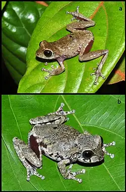 - ^ a b c d e Seshadri, K. S.; Gururaja, K. V.; Aravind, N. A. (2012). "A new species of Raorchestes (Amphibia: Anura: Rhacophoridae) from mid-elevation evergreen forests of the southern Western Ghats, India". Zootaxa. 3410: 19โ34. doi:10.11646/zootaxa.3410.1.2.