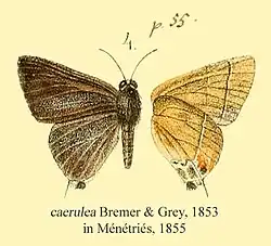 - ^ Savela, Markku (March 10, 2019). "Rapala caerulea (Bremer & Grey, [1851])". Lepidoptera and Some Other Life Forms. Retrieved February 6, 2020.
