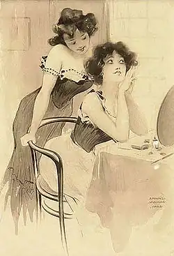 Raphael Kirchner produced over a thousand published paintings and drawings in his lifetime, mostly in the form of picture postcards. His orientalist "Geisha" series was among his most popular, with over 40,000 cards sold.[1] The series is a notable example of the cross-influence between Art Nouveau in the West and Japanese art of the Meiji and Taishō periods. Kirchner's often mildly erotic paintings of feminine beauty, in convenient postcard and magazine page form, were among the early pin-ups favored by European and American soldiers in World War I.[1]