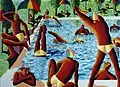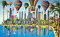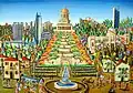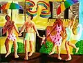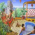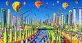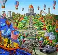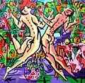 Perez paints urban landscapes in a naïve style, depicting life in the city streets, parks, and public places in a palette of bright colors. Many of his works are grouped by series – men and women, gay families, spherical paintings of Tel Aviv and Jerusalem as multi-cultural centers.[2] His early work focused on human relationships, sometimes using flowers as a metaphor. Perez's artistic career began when he was still living with women. He often painted heterosexual couples, but even then, one discerned Perez's inner conflicts and attempt to grapple with the complexities of couplehood.[4]