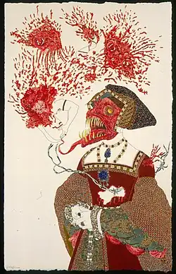 Shaw's paintings suggest a fantastical world full of intricate detail, rich colour and jewel-like surfaces, all masking a collection of intensely violent and sexual images. Fused with an eco-system of vibrantly painted flora and fauna, half human/half animal creatures, with screaming mouths and engorged or bleeding eyes are characters in a dizzying scene of erotic hedonism, both explosive and gruesome in its debauchery.[4]: 10